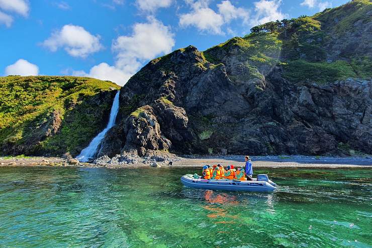4. Путь по морю. Переход на катере занимает около 40 минут. По пути открываются потрясающие виды на прибрежные скалы и островки, где гнездятся бакланы, кайры и морские орланы.