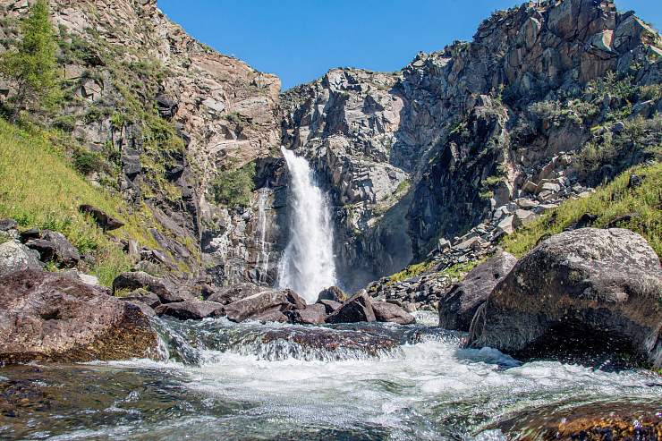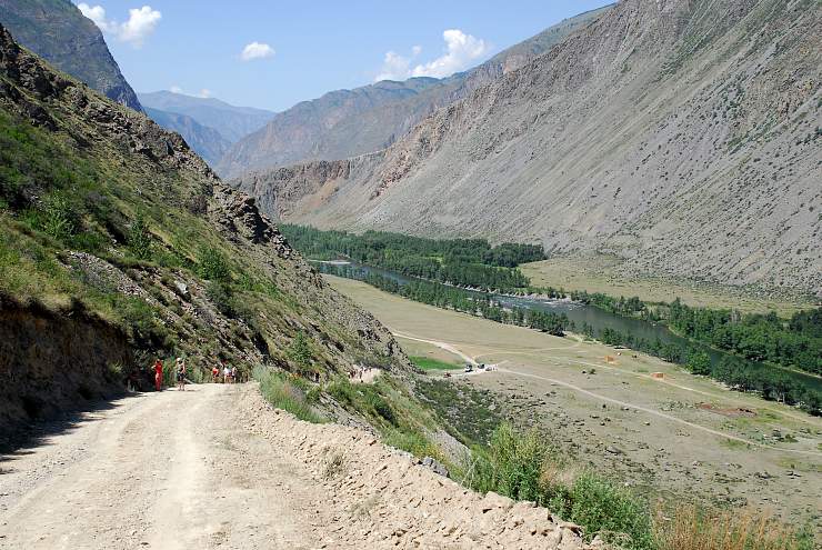 После спуска открывается одна из самых красивых долин Горного Алтая. Чулышман часто называют страной водопадов: вдоль долины действительно встречается много водных каскадов, а сам ландшафт здесь очень кинематографичный – высокие борта ущелья, бурная река, зеленые участки у воды и сухие каменные склоны выше.