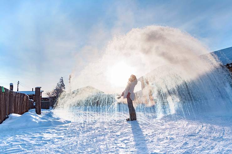 Ледяной салют – знаменитый трюк с выплескиванием кипятка, который на лету превращается в облако сверкающих кристаллов иней – обязательный ритуал для каждого гостя.