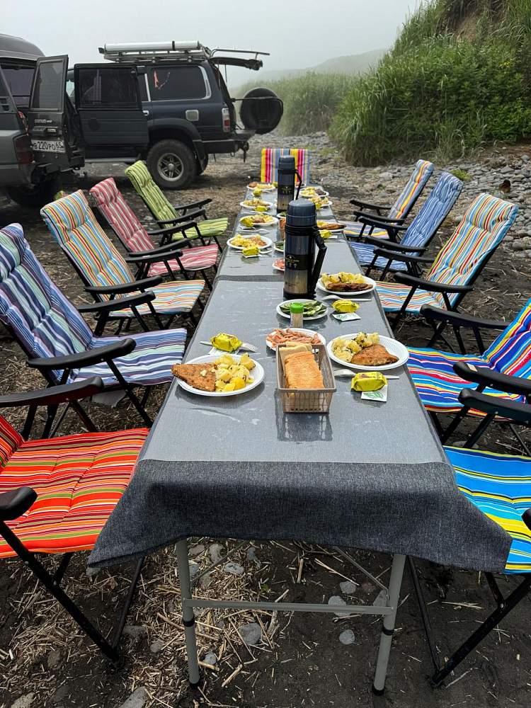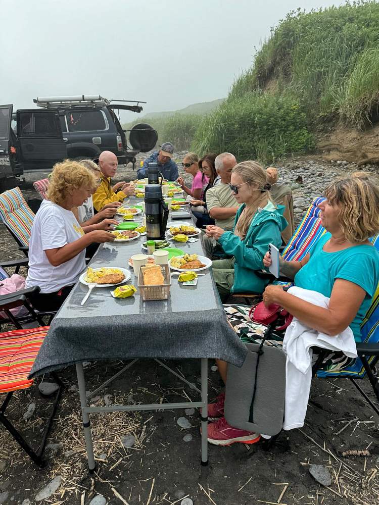 13:30 Обед на берегу Тихого океана (жареная рыба, отварной картофель, рыбные пресервы, овощная нарезка, чай с баранками). (*Если обед будет невозможно организовать на природе по погодным условиям, обед будет предоставлен в кафе). Отдых на берегу.