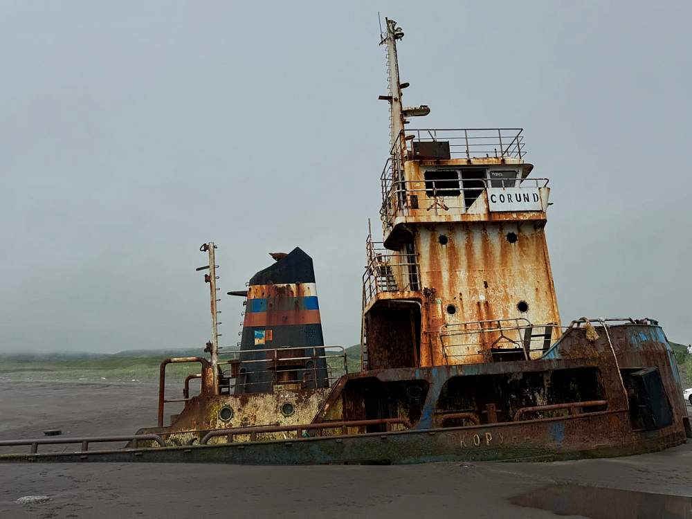 Вторая остановка – на «зеркальном» пляже, похожем на бескрайнее морское зеркало. Выброшенное на мель рыболовное судно – самый популярный фотообъект у гостей острова Итуруп.