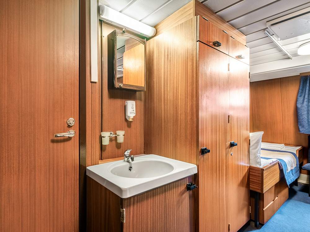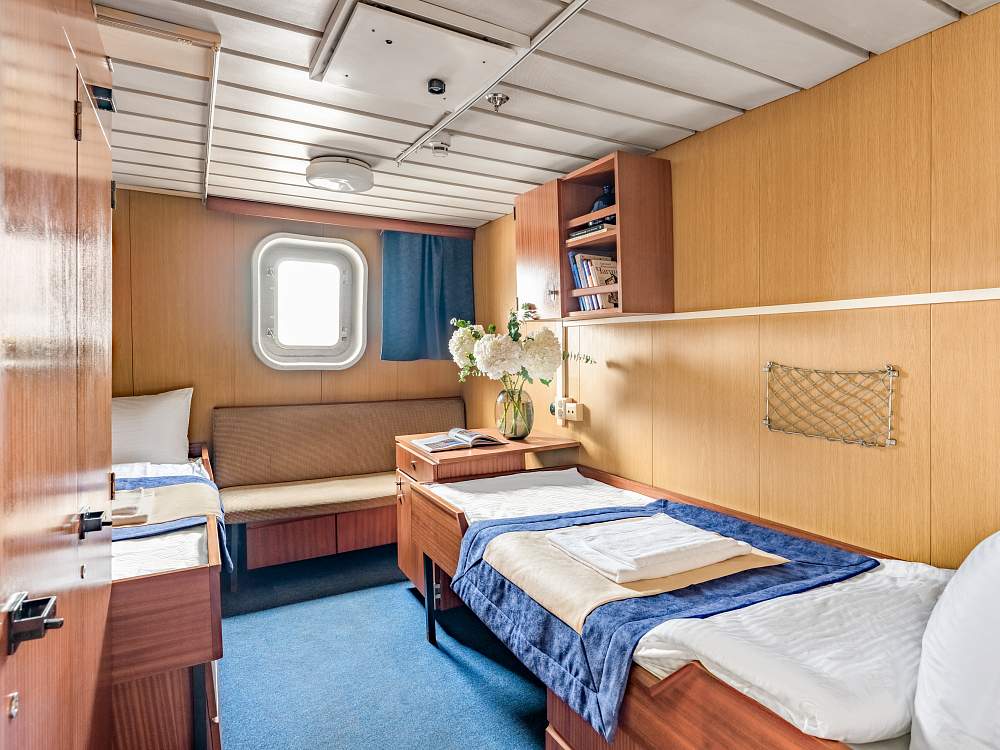 два нижних и одно верхнее спальные места, письменный стол, шкаф, тумбочки, умывальник (удобства на палубе совмещенные, общие на 2 каюты), иллюминатор