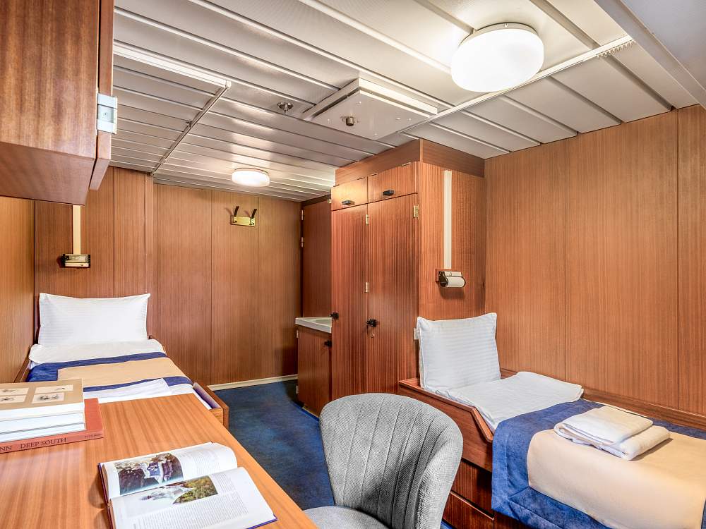 два нижних (или нижнее и верхнее) спальных места, письменный стол, шкаф, тумбочки, умывальник (удобства на палубе совмещенные, общие на 2 каюты), иллюминатор