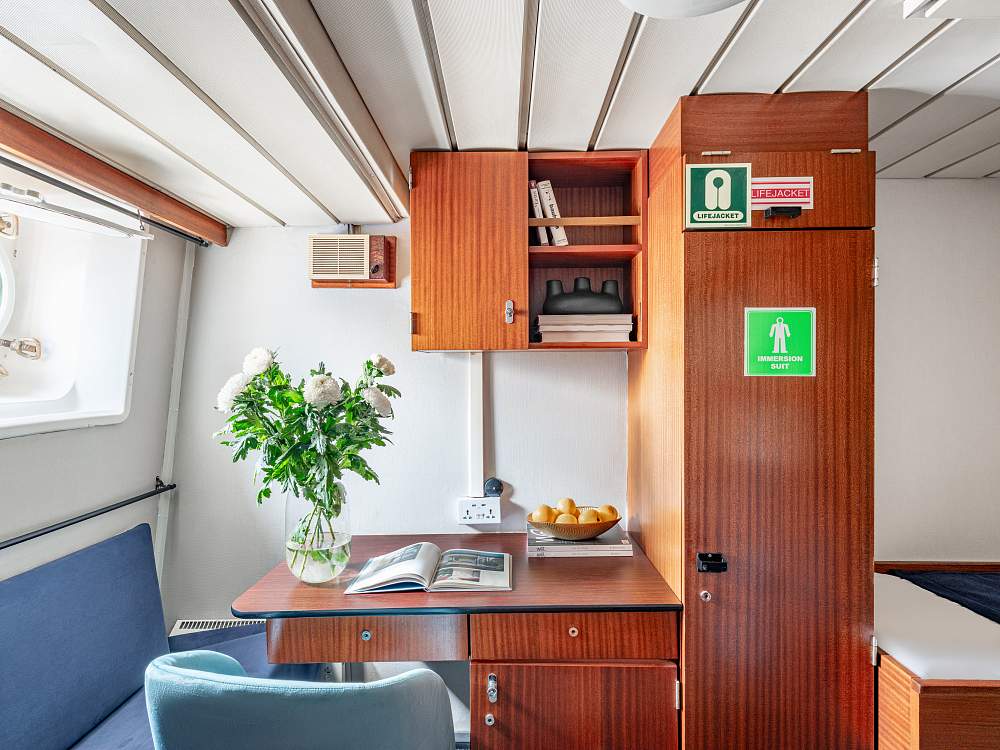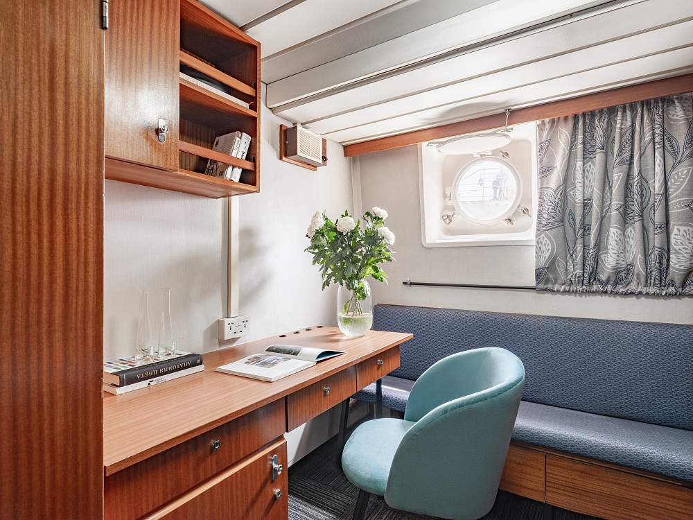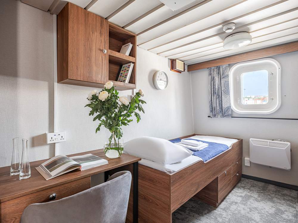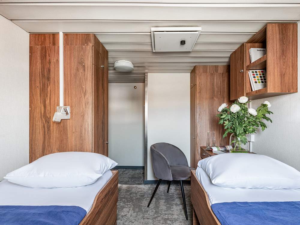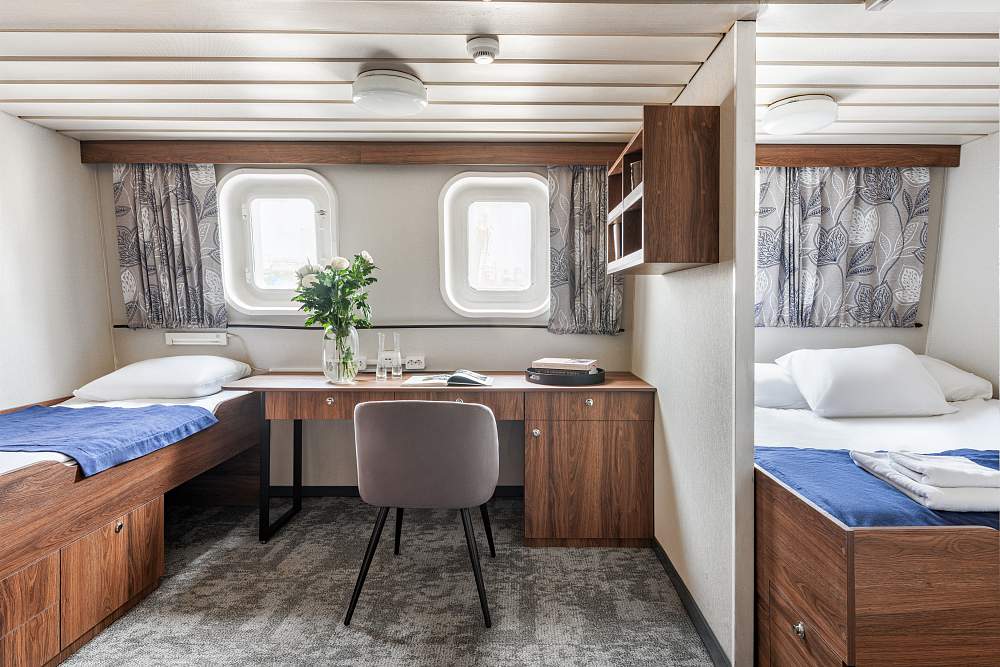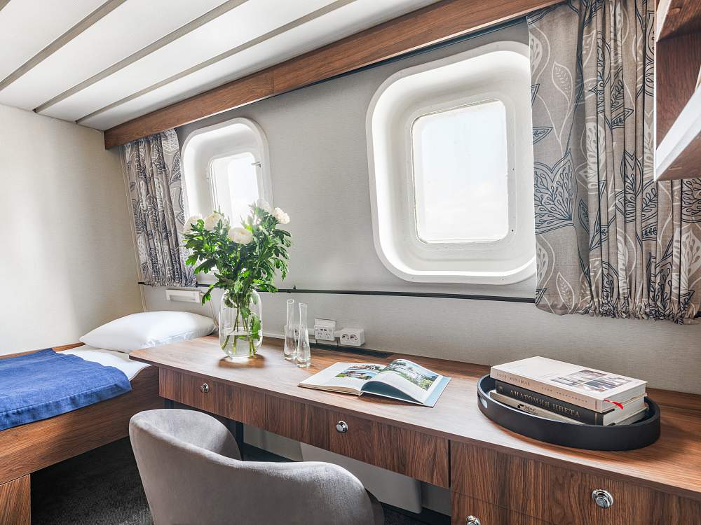 два нижних спальных места, письменный стол, шкаф, тумбочки, умывальник (удобства на палубе совмещенные, общие на 2 каюты), иллюминатор