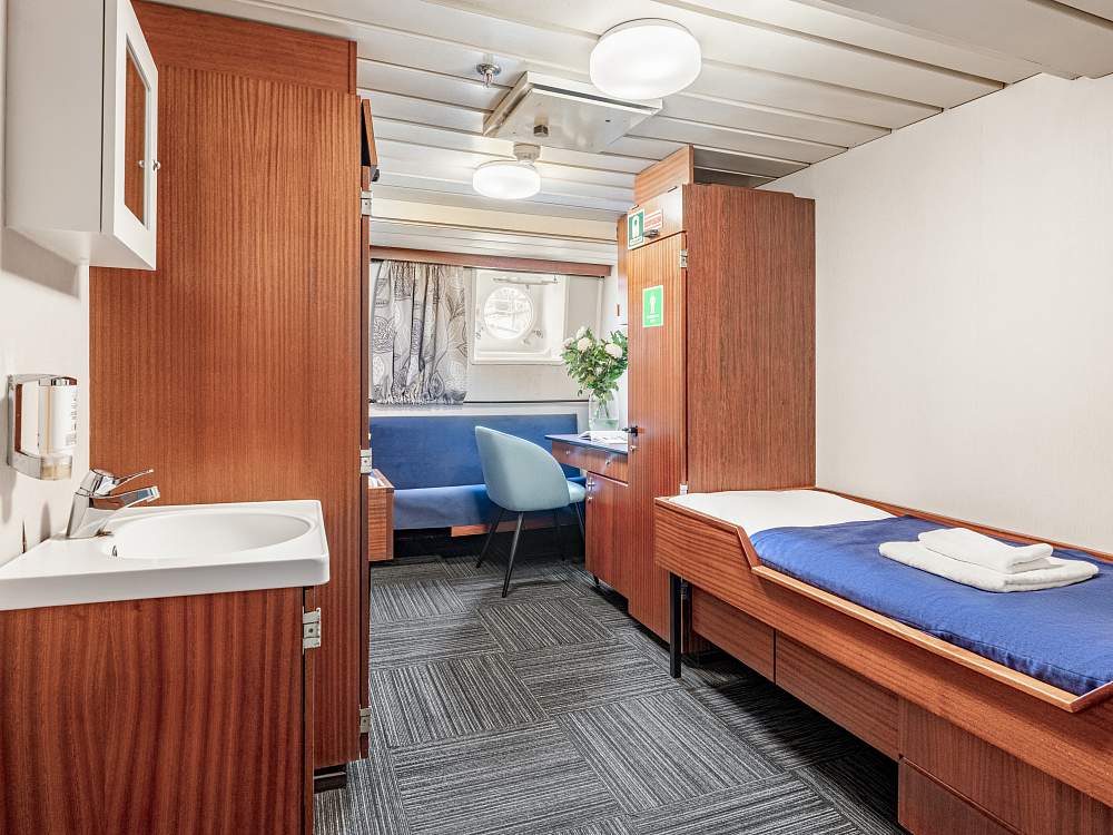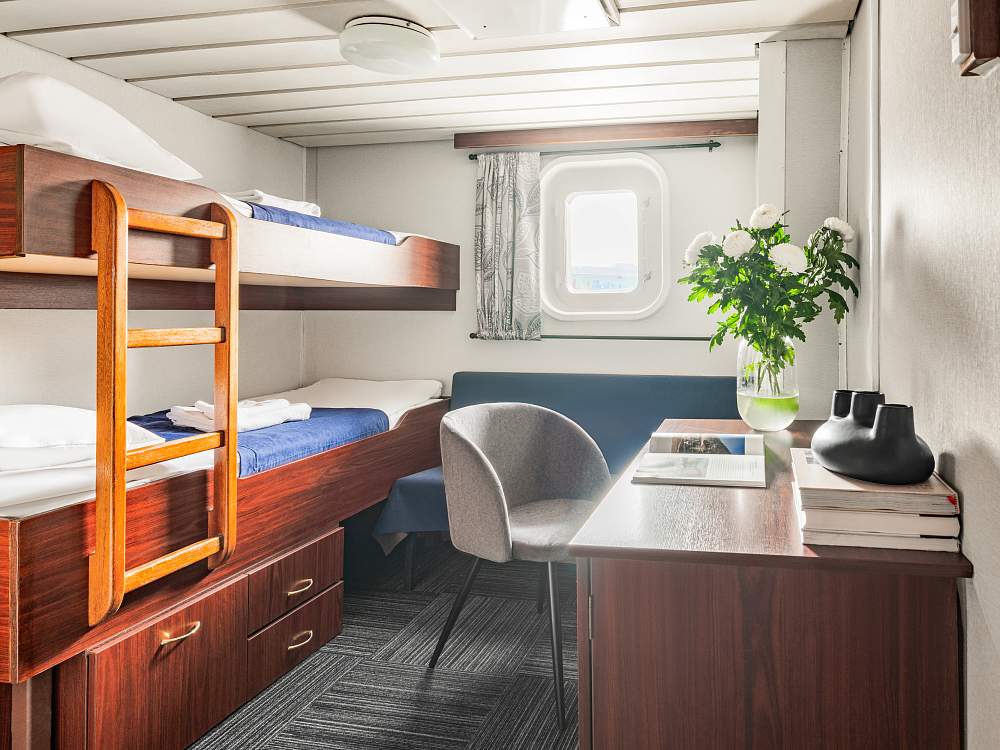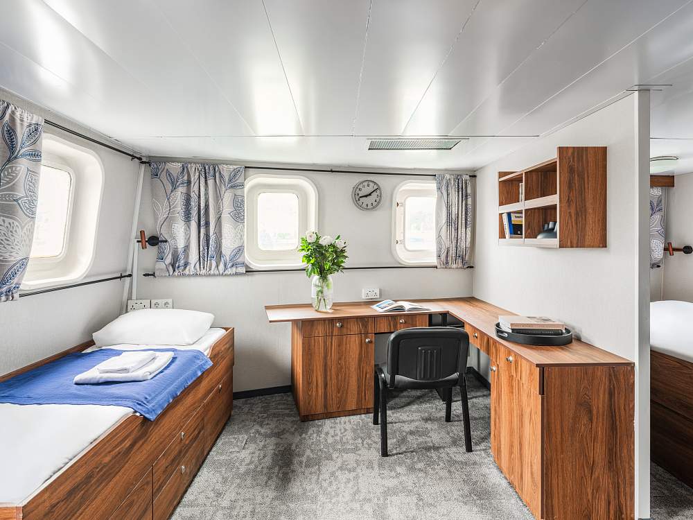два нижних и одно верхнее спальные места, письменный стол, шкаф, тумбочки, умывальник (удобства на палубе совмещенные, общие на 2 каюты), иллюминатор