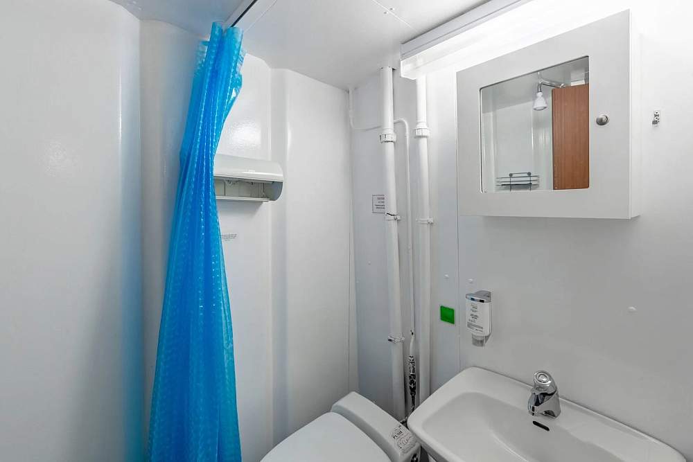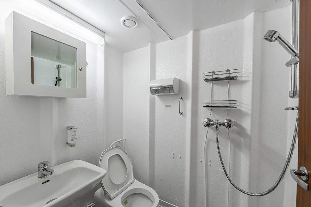 два спальных места – верхнее и нижнее, письменный стол, шкаф, тумбочки, ванная: душ, туалет, умывальник, окно