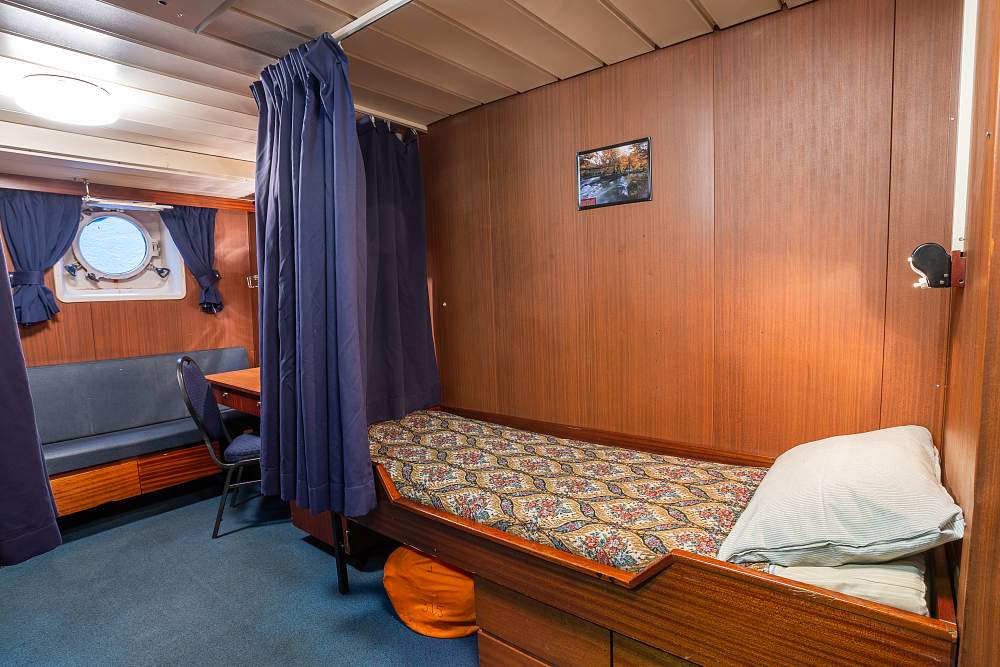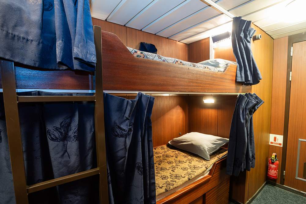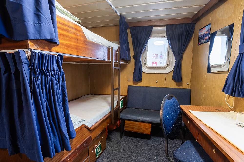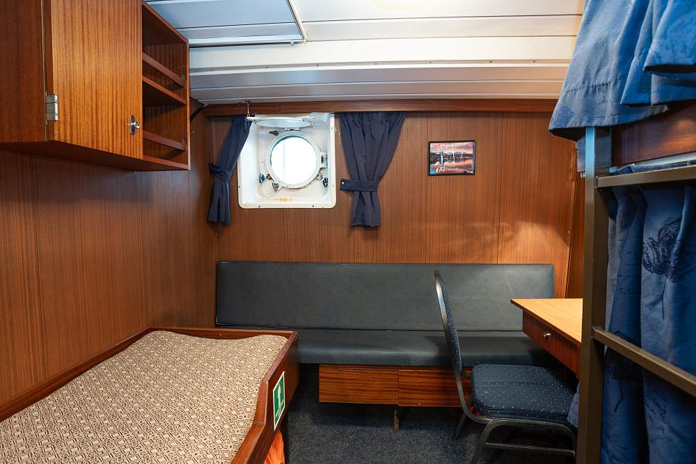 Каюта «Трипл» (трех/четырехместная) (10–11 м²). (В каюте: три кровати: две нижние и одна верхняя, диван, письменный стол с креслом, тумбочка, два шкафа для одежды, окно или иллюминатор) – 800 000 рублей с человека