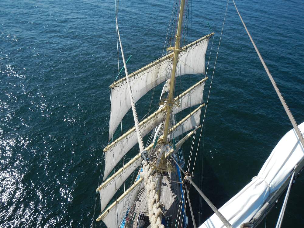 Судно становится на рейд у Балтийска (место якорной стоянки судна). В последний раз за экспедицию группа трейнизов собирается на палубе для торжественного подъема флага. Если погода позволит, у нас будет еще одна возможность подняться на мачты и бушприт – чтобы запомнить этот вид и попрощаться с парусником с высоты птичьего полета.