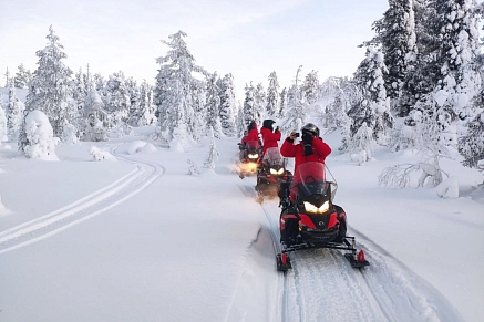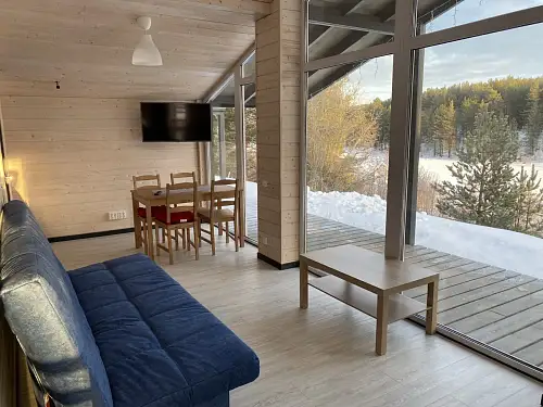 Маршрут на снегоходах стартует от комплекса гостевых домов. Комплекс представляет собой два гостевых дома с большими панорамными окнами и видом на самый длинный подвесной мост Северо-Запада, соединяющий крутые берега реки Нива.