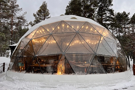 Ночь вы проведете в уютных шатрах-полусферах в окружении соснового леса.