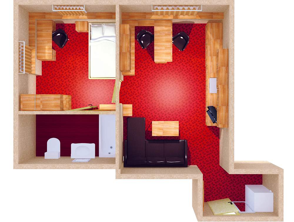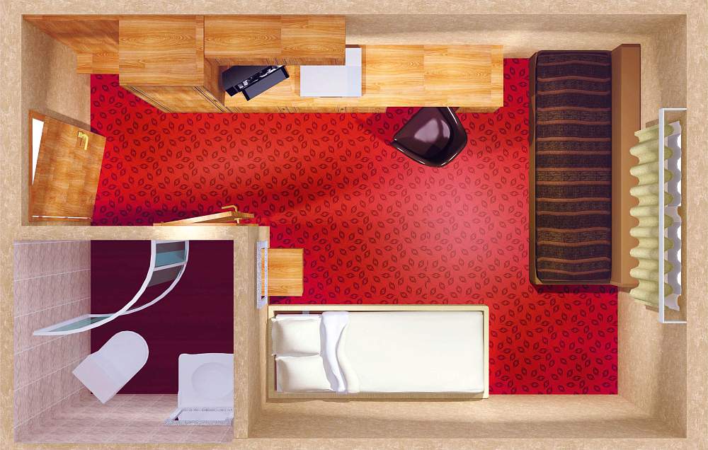 1 комната с выделенной зоной отдыха (21 м²), 2 окна (открываются), кровать (отделена ширмой), диван, письменный стол, телевизор, DVD-проигрыватель, холодильник, ванная комната (туалет, душ)