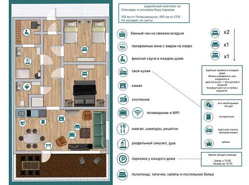 Из панорамных окон уютного дома открывается вид на зимний лес и озеро, к услугам гостей есть камин и сауна.